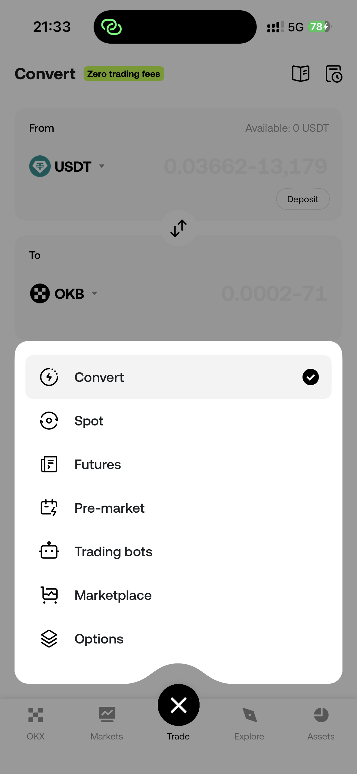 Homepage → "Trade" → "Convert" → USDT to OKB → Confirm conversion